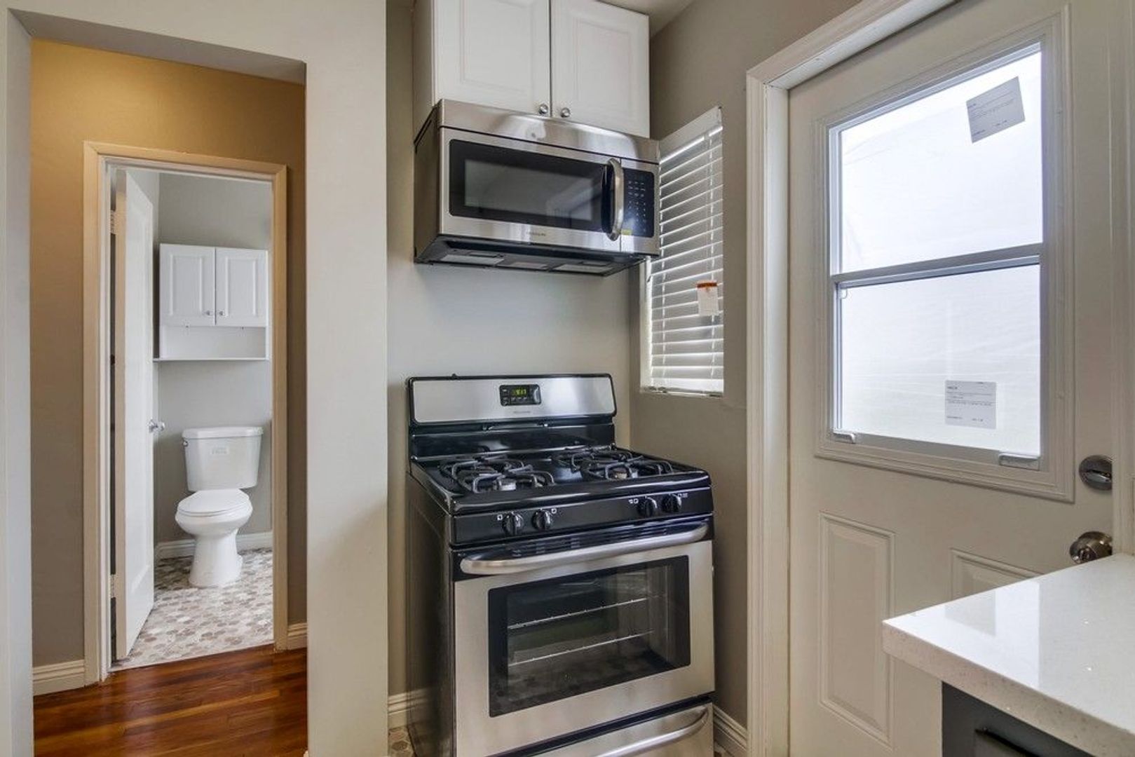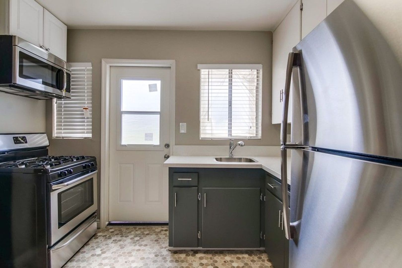 - Stainless steel appliances including microwave