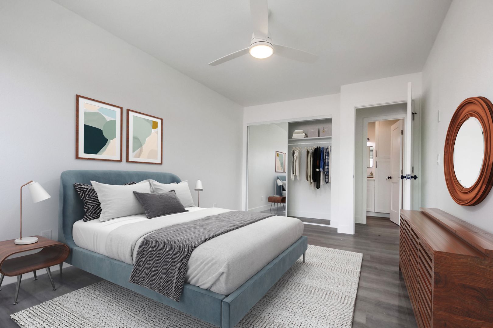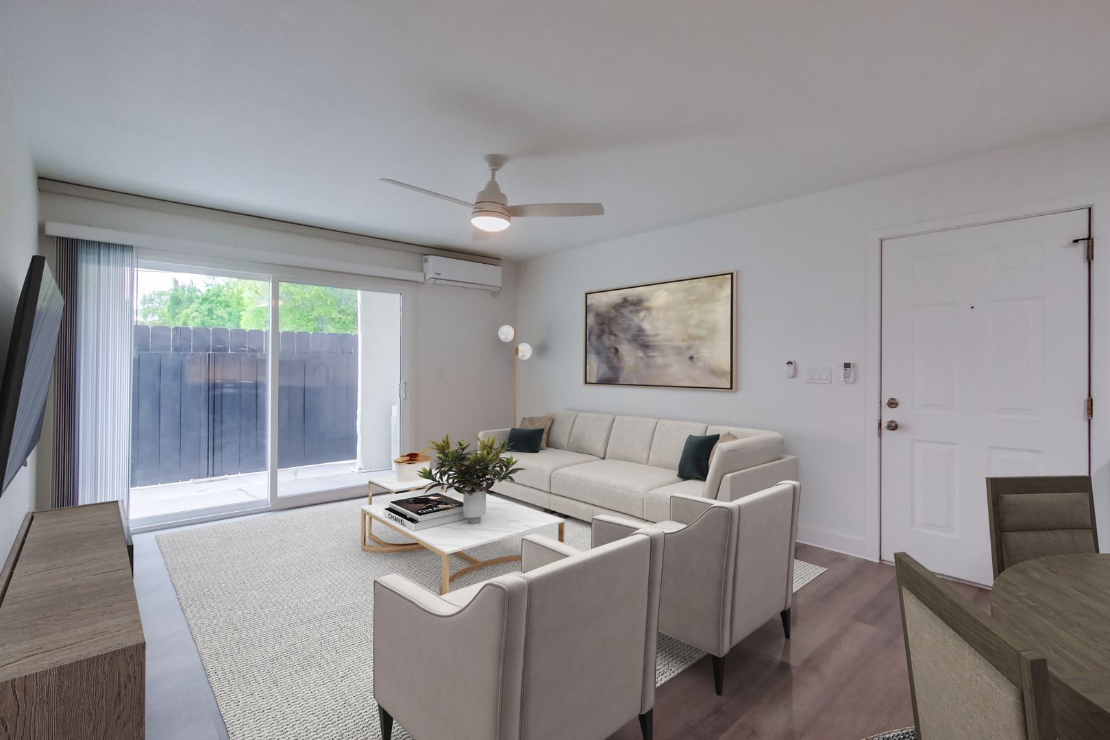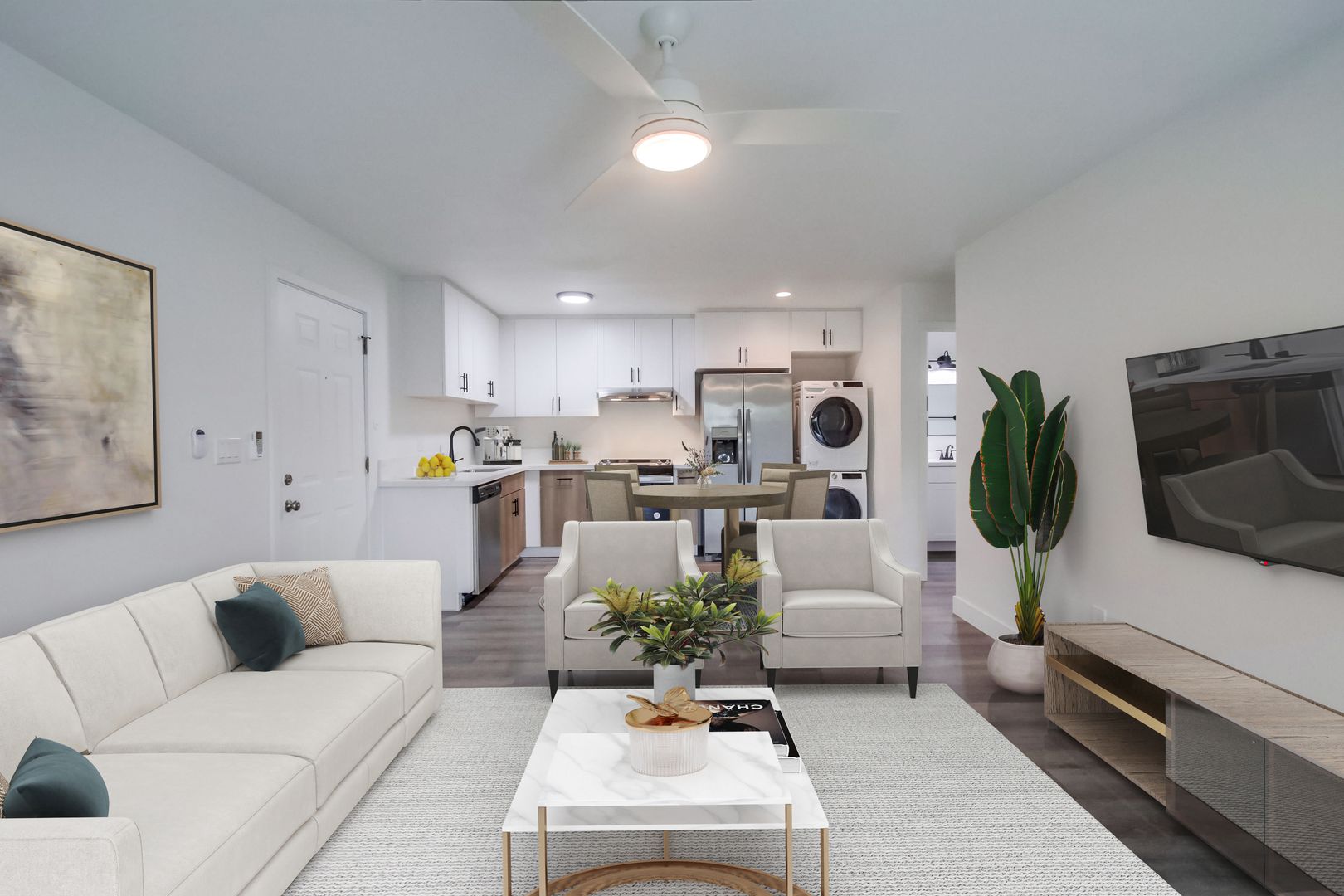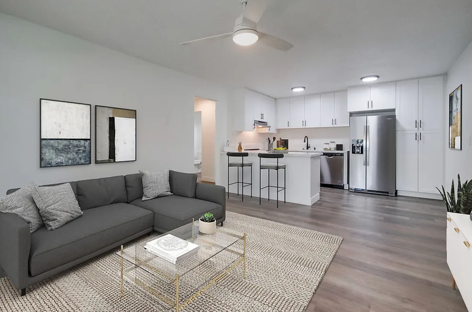 Designer Finishes: Custom paint and wood-style flooring create a warm and inviting ambiance throughout the apartment.