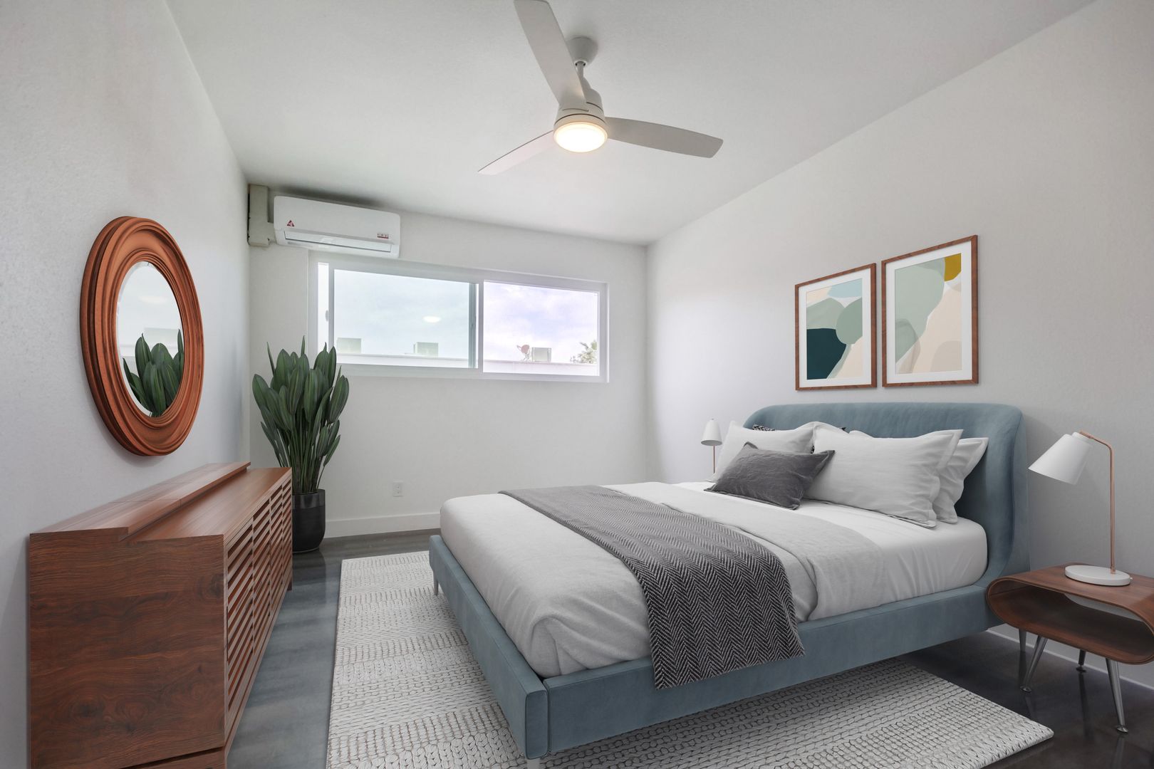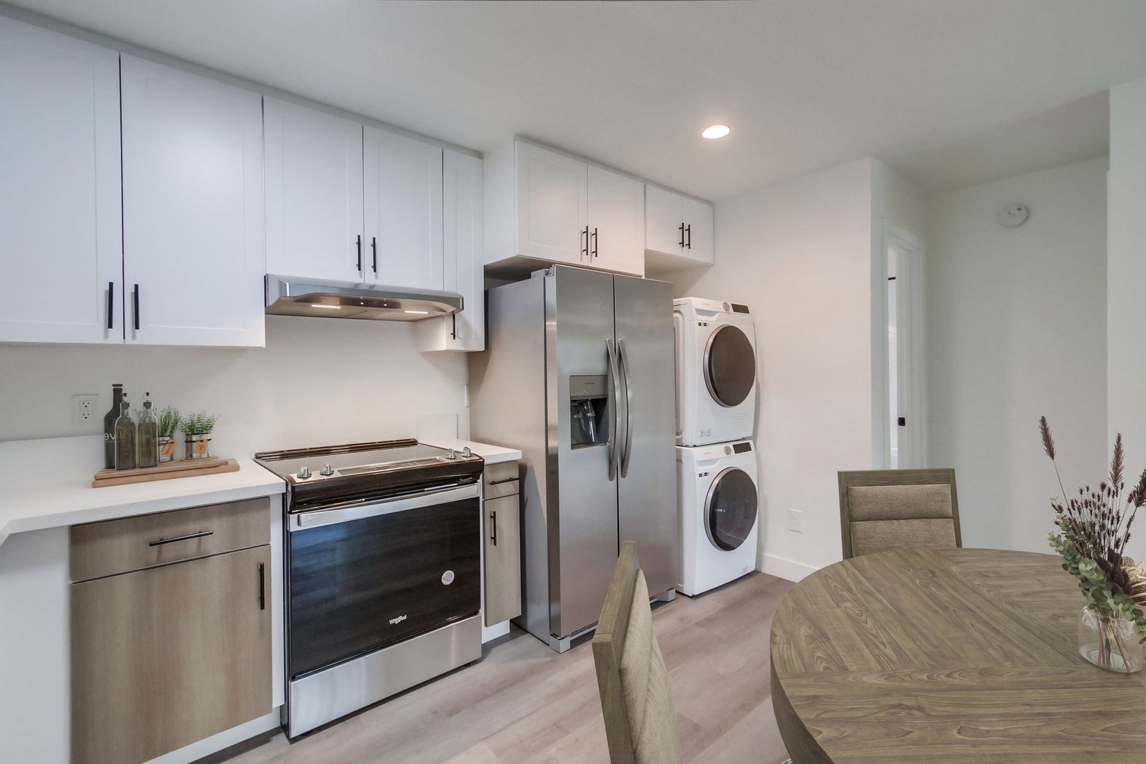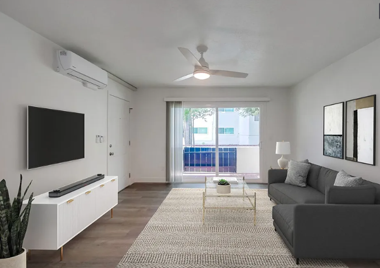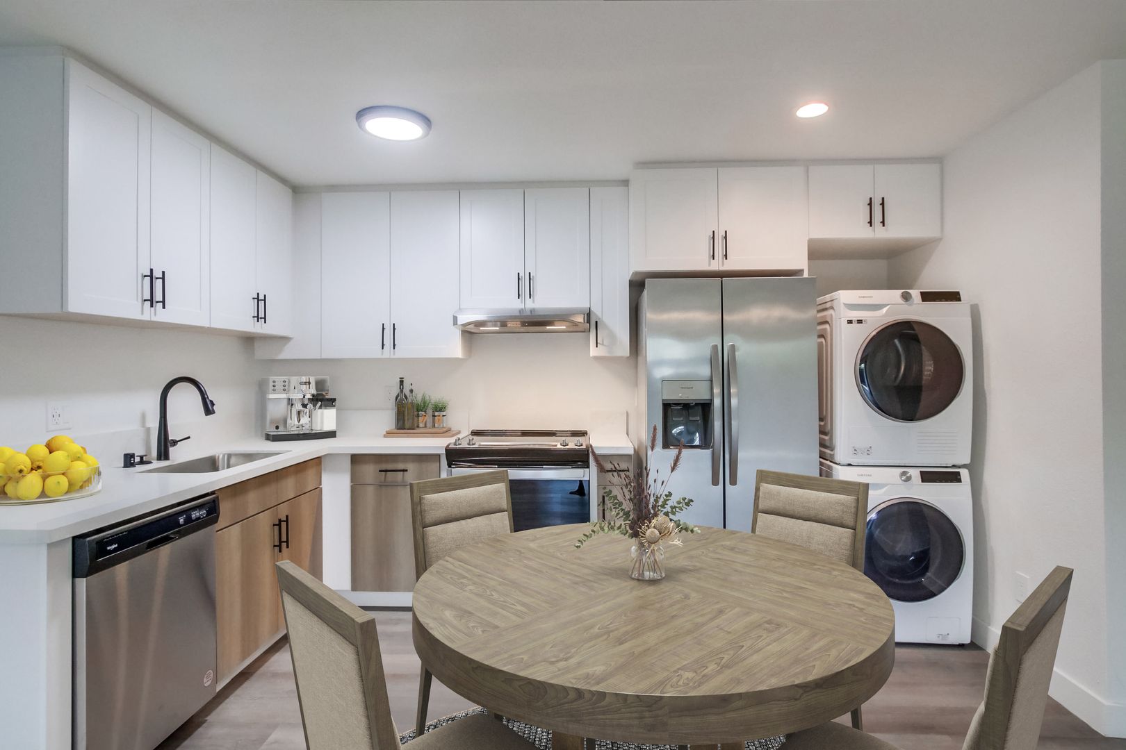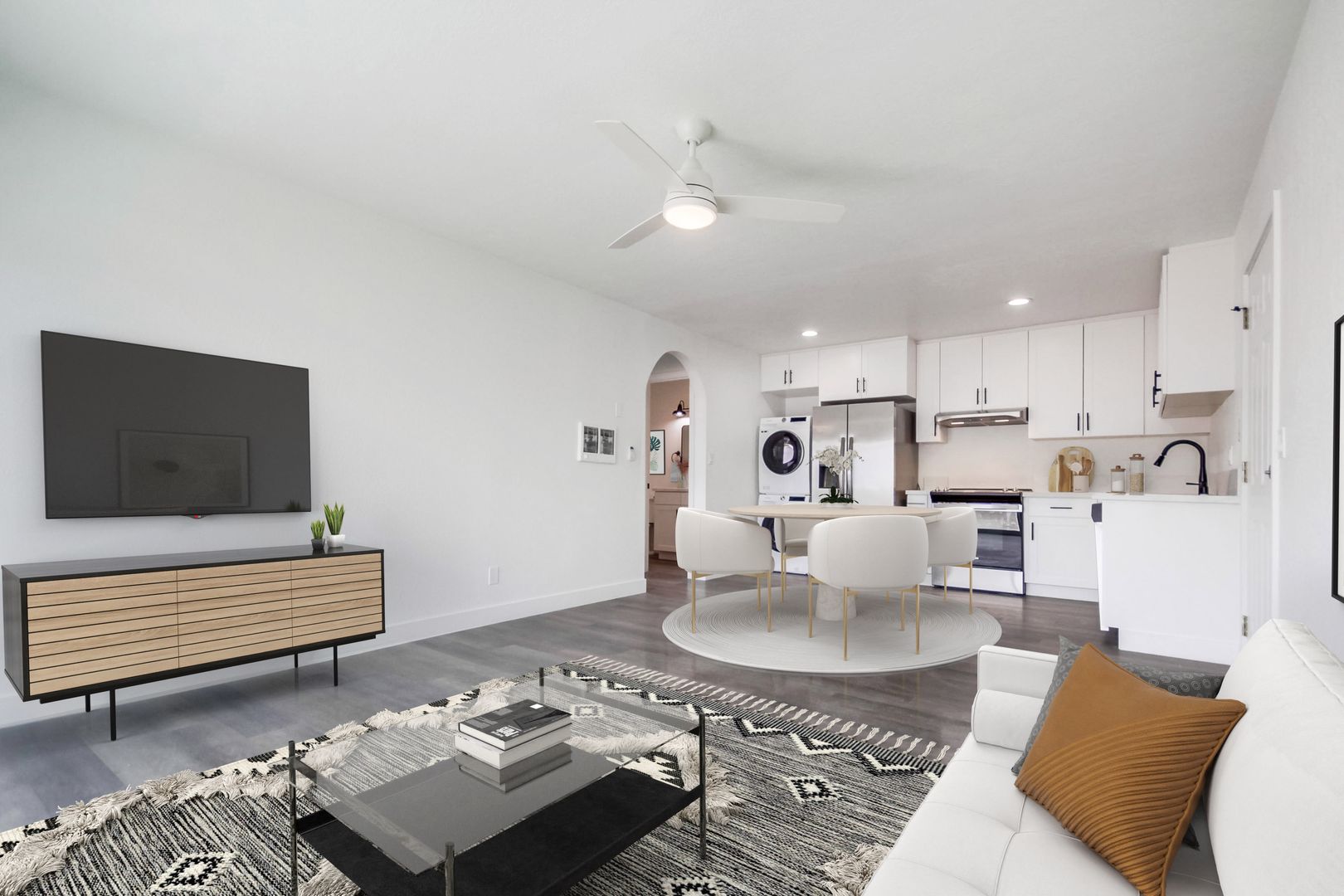 Designer Finishes: Custom paint and wood-style flooring create a warm and inviting ambiance throughout the apartment.